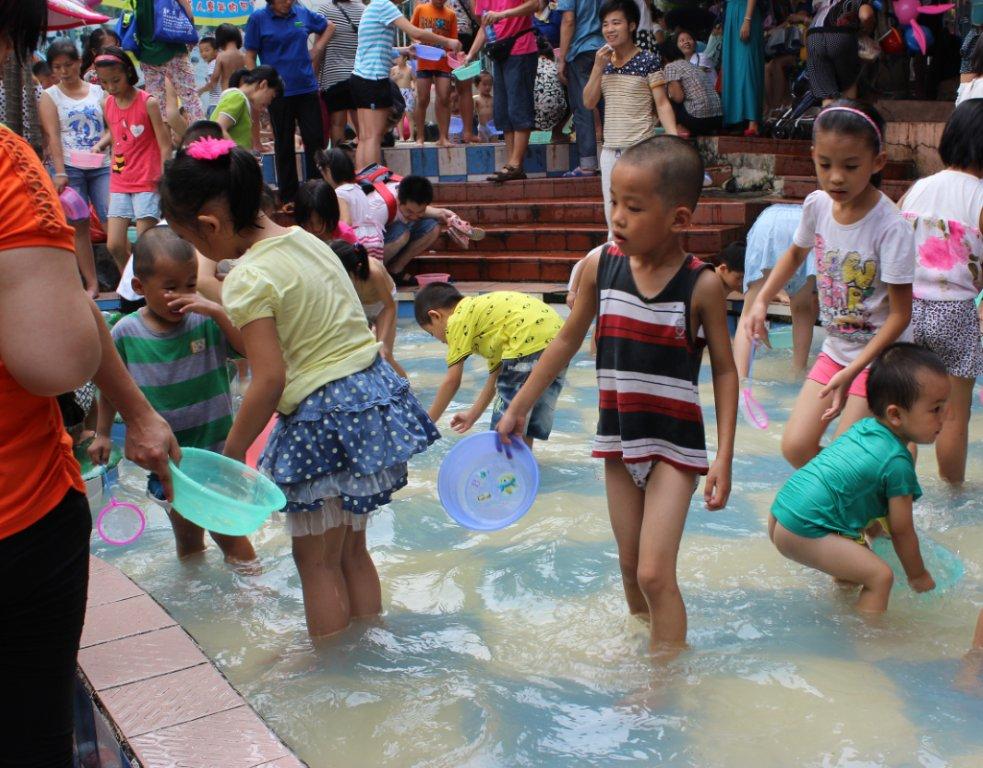 La foto documenta un bizzarro spettacolo: decine e decine di bambini ( più o meno vestiti ), vanno a caccia con le loro bacinelle di impauriti pesciolini che in una spanna d'acqua non hanno scampo!