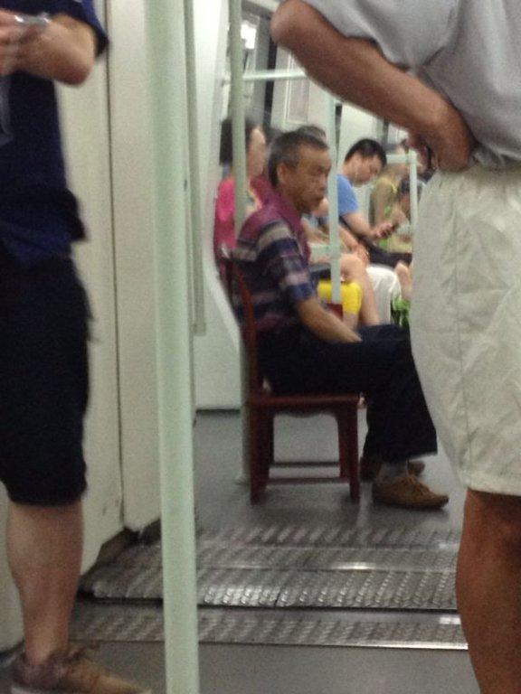 Un signore ( probabilmente stufo di dover sempre affrontare viaggi in piedi in metropolitana ), ha deciso che lui non rischia più...LA SEDIA SE LA PORTA DIRETTAMENTE DA CASA!!!!!!!!!!!